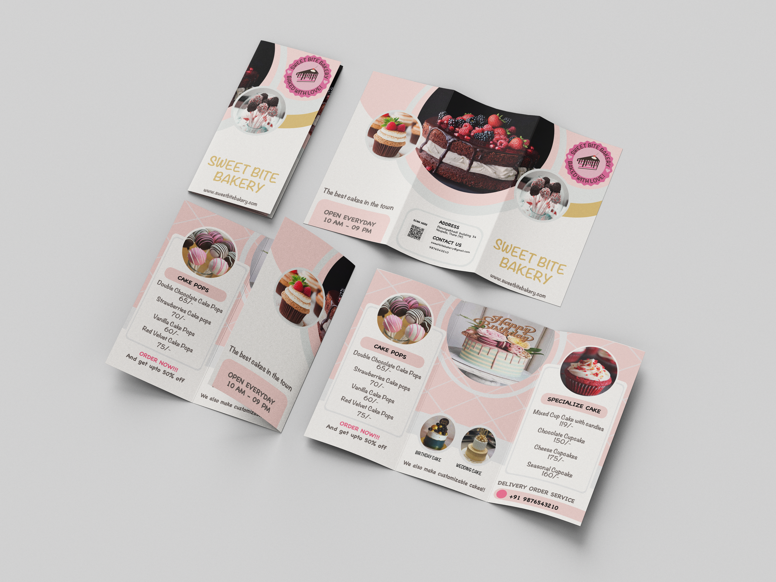 A full branding project for Sweet Bite Bakery, including logo design, promotional flyer, trifold brochure, and custom packaging. This project showcases a playful visual identity tailored for a modern bakery.